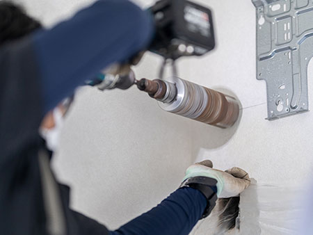 刃先にダイヤモンド砥粒が埋め込まれたダイヤモンドビットを高速回転させ、対象部材に押し当てます。コンクリートをはじめとしたALCや押出成形セメント板、ブロック、石、金属系サイディング等、様々な材質の母材や構造物を低騒音低振動で穿孔する技術です。